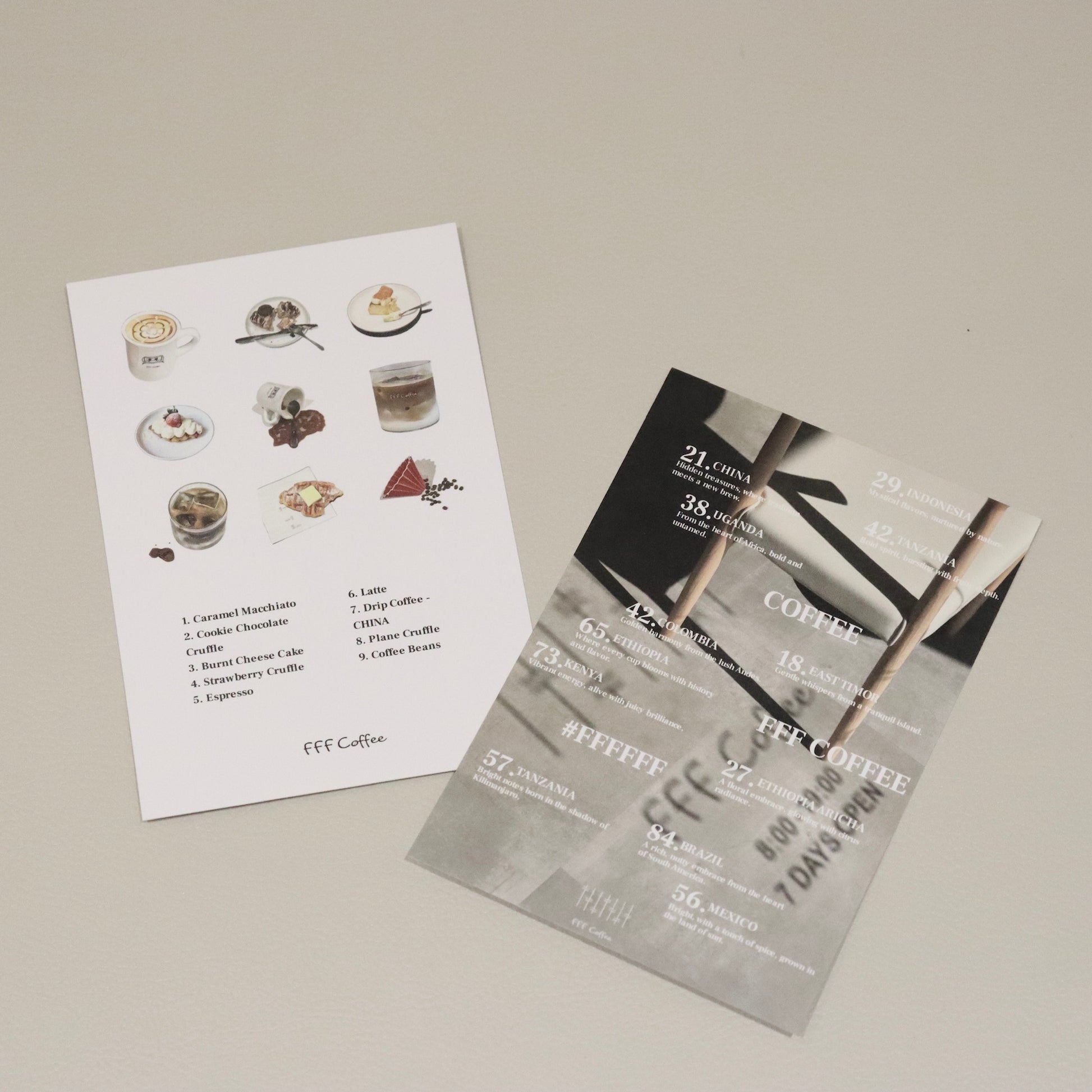 This FFF Coffee original set includes two postcards: